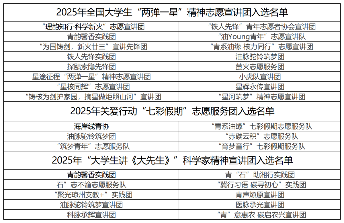近日,共青團中央公布了2025年全國大學生“兩彈一星”精神志愿宣講團和關愛行動“七彩假期”志愿服務團入選團隊名單。中石大共有22支團隊入選,同時也是“兩彈一星”精神志愿宣講活動首都唯一入選的全國16所重點聯系高校之一。此外,北京市科學技術協會公布了2025年“大學生講《大先生》”科學家精神宣講團名單,中石大共10支團隊入選。