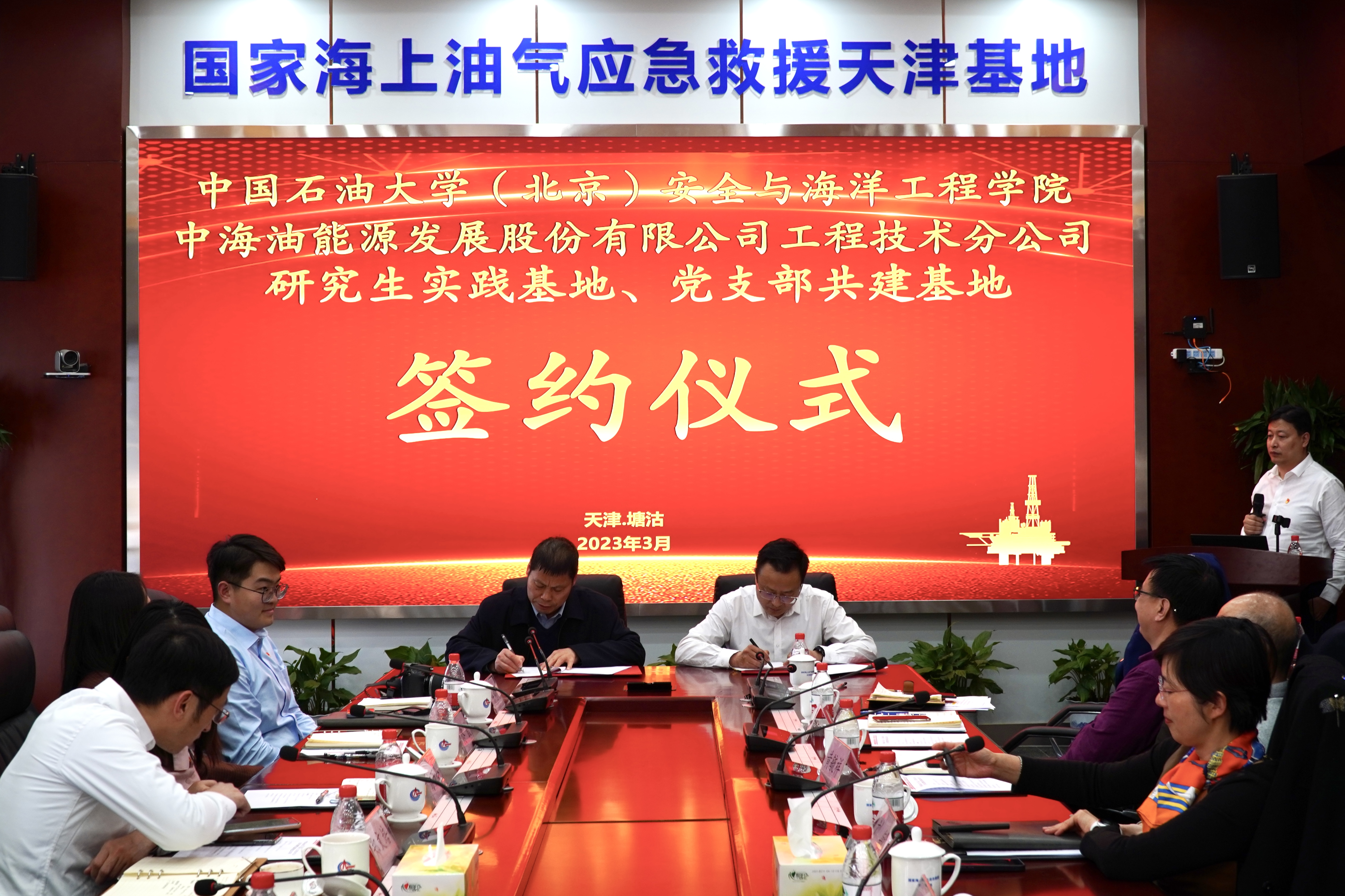 為深入學(xué)習(xí)貫徹黨的二十大精神,積極探索黨建引領(lǐng)下院企產(chǎn)教融合、協(xié)同育人的創(chuàng)新模式,3月2日,中國石油大學(xué)(北京)安全與海洋工程學(xué)院副院長、深海工程創(chuàng)新團隊黨支部書記楊進帶隊前往中海油能源發(fā)展股份有限公司工程技術(shù)公司開展共建交流,簽訂校企黨支部結(jié)對共建協(xié)議和研究生實踐培養(yǎng)協(xié)議,并為井控中心與安全學(xué)院實習(xí)實踐基地揭牌。