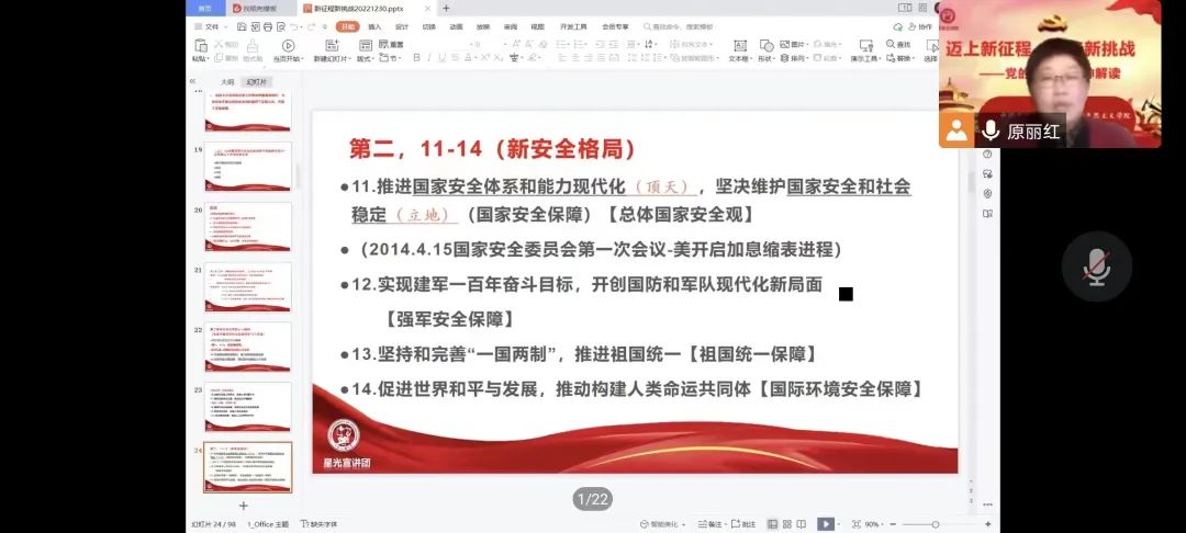舉辦宣講活動(dòng)深入學(xué)。學(xué)院各基層黨團(tuán)組織結(jié)合實(shí)際開(kāi)展宣講活動(dòng),掀起黨的二十大精神學(xué)習(xí)熱潮。學(xué)院邀請(qǐng)中國(guó)石油大學(xué)(華東)馬克思主義學(xué)院副教授、中國(guó)化馬克思主義研究中心副主任原麗紅作了題為“邁上新征程,迎接新挑戰(zhàn)——黨的二十大精神解讀”的專題報(bào)告,結(jié)合重大歷史事件,深入剖析了黨的二十大報(bào)告的關(guān)鍵內(nèi)容,全面解讀了黨的二十大會(huì)議精神。各黨團(tuán)支部結(jié)合支部實(shí)際,邀請(qǐng)學(xué)校二十大精神宣講團(tuán)成員開(kāi)展精神宣講,系統(tǒng)梳理黨的二十大精神內(nèi)涵,深化會(huì)議精神學(xué)習(xí)。