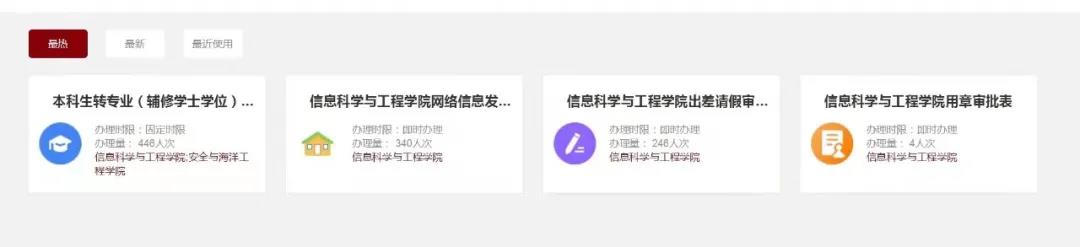 在“我為師生辦實事”實踐活動中,學院依托學校e服務平臺,上線了《本科生轉專業(yè)申請表》、《網(wǎng)絡信息發(fā)布審批表》、《師生科研出差報銷審批單》和《學院公章使用審批表》等工作表單,表單的上線數(shù)量和使用頻次在學校院級單位中是最多的,讓數(shù)據(jù)多跑路,讓師生少跑腿,最大化實現(xiàn)師生自助服務,極大方便了師生,提高了學院管理水平。