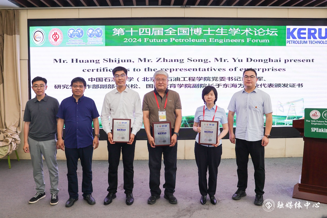周東波代表SPE北方分會向本屆全國博士生學術論壇的召開表示祝賀,鼓勵參賽選手激發創新激情、拓寬學術視野,并祝愿論壇越辦越好,進一步帶動未來能源產業蓬勃發展,助力“雙碳”目標實現。石油工程學院黨委書記黃世軍、學生工作部研究生工作部副部長張松和國際教育學院副院長于東海為企業代表頒發了贊助證書。