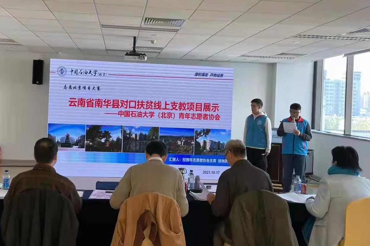 10月25日,由團中央青年志愿者行動指導中心、中共北京市委宣傳部指導,共青團北京市委員會、北京市志愿服務聯合會等單位聯合主辦的2021年首都志愿服務項目大賽決賽落下帷幕。中國石油大學(北京)青年志愿者協會對口云南省南華縣線上支教項目經過初賽、復賽、決賽等環節,最終從全市767個項目中脫穎而出,獲評銅獎。