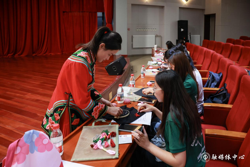 丁蘭英還為學校師生準備了彝繡體驗道具。活動現場,繡娘一對一指導師生體驗非遺文化技藝。學校為丁蘭英頒發了“文化創意導師”聘書以及雙百講壇“特別主講人”獎牌。