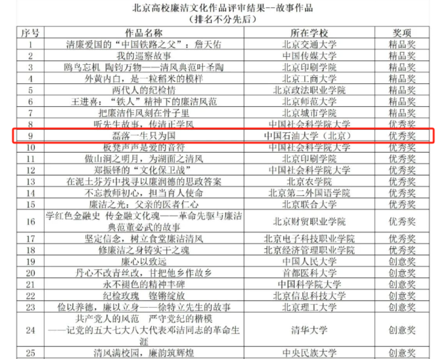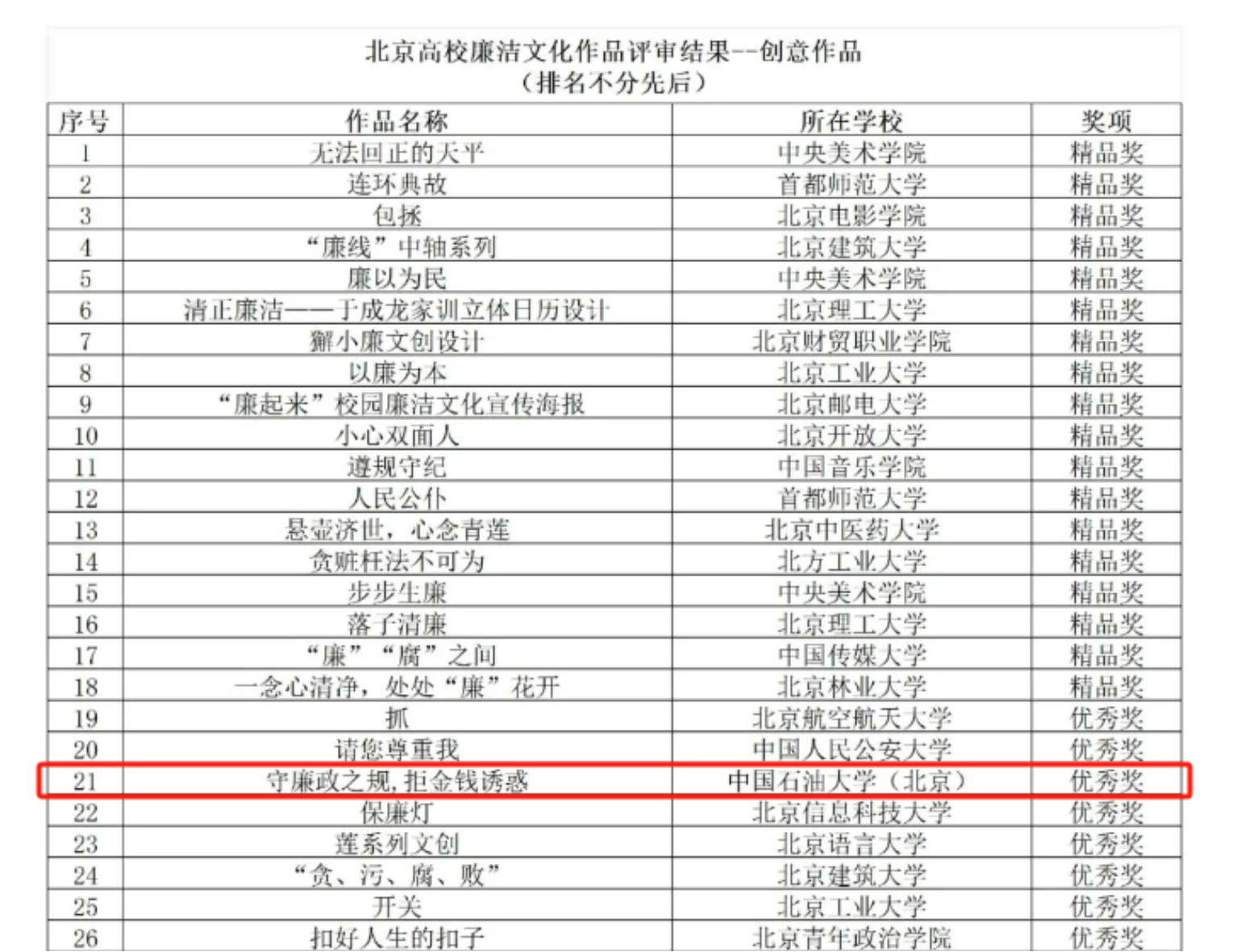 馬克思主義學院教師馮文燕主講的網絡微課“歷覽前賢國與家,成由勤儉破由奢”入選第九屆高校廉潔教育系列活動“一校一金句”網絡微課,期刊社教師鄭秀娟創作的散文“磊落一生只為國”獲評北京高校廉潔文化作品(故事作品)優秀獎,石油工程學院研究生錢春龍設計的作品“守廉政之規,拒金錢誘惑”獲評北京高校廉潔文化作品(創意作品)優秀獎。