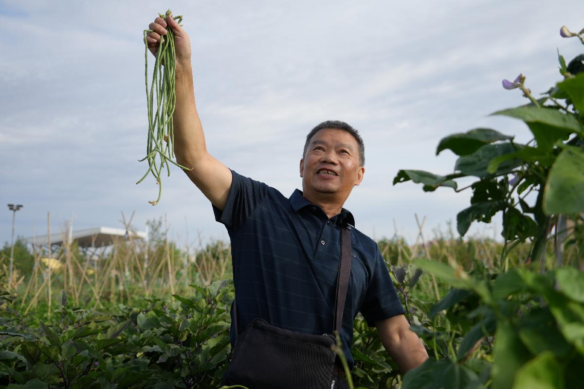 圖為銀齡教師在克拉瑪依校區試驗田上采摘果蔬