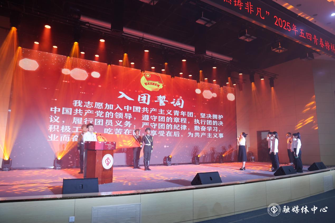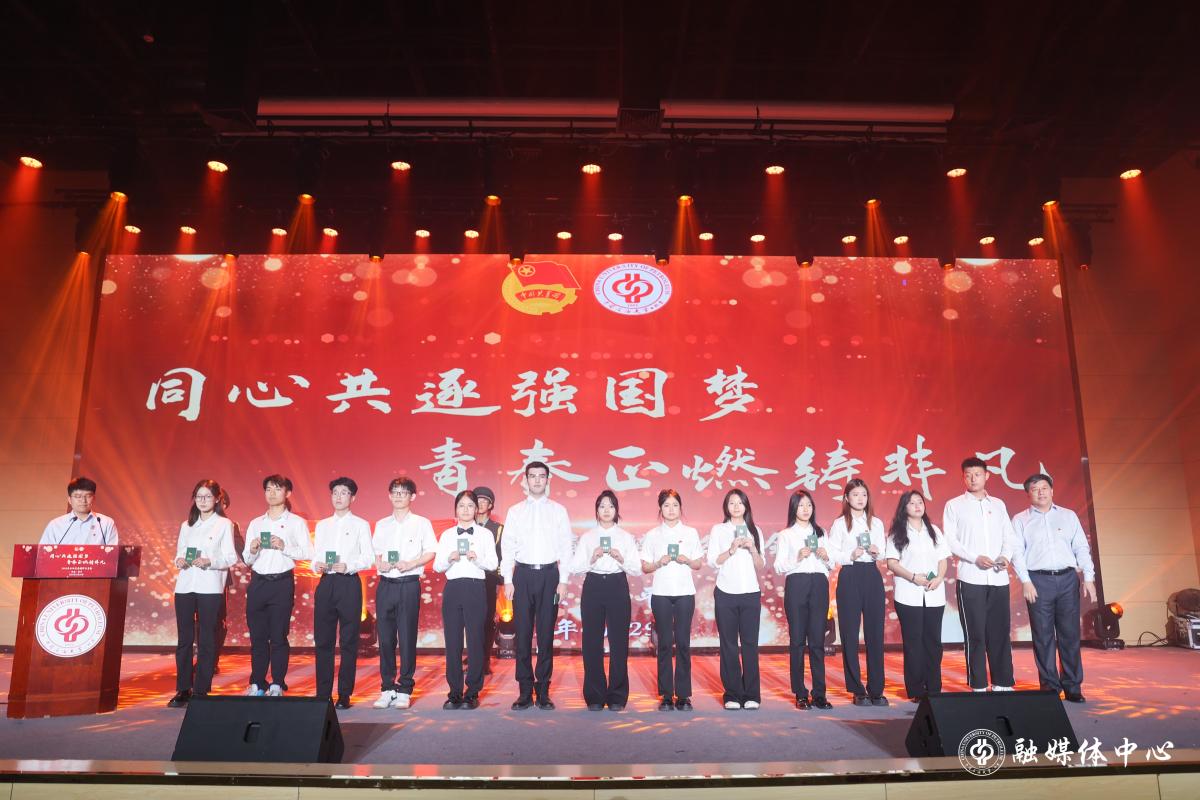 會前,學校黨委副書記、紀委書記韓克飛為新發(fā)展團員代表佩戴團徽、頒發(fā)團員證,校團委書記周學智主持入團儀式,人工智能學院團委書記代莉莎帶領新發(fā)展團員進行入團宣誓。