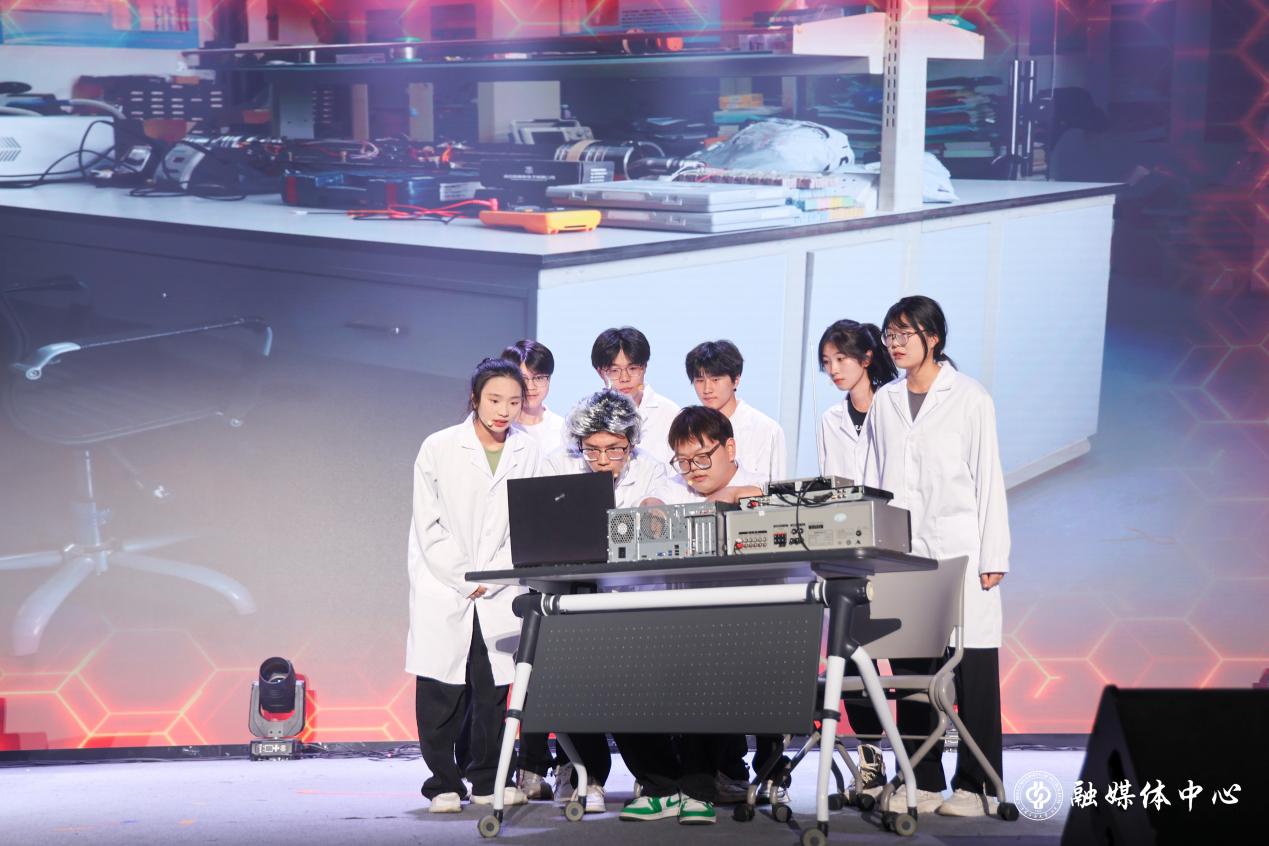 “敬不凡”篇章中,情景劇《地心密鑰》通過情景劇、數(shù)據(jù)可視化與裝置模型演繹,展現(xiàn)青年科研團隊突破萬米深地極限的壯舉。相聲劇《人機智斗論》,以一臺人工智能學院自主編程的人形機器人(具身智能)為核心,展現(xiàn)AI的思考力、大模型的可進化力、具身智能的互動力,同時讓具身智能小菜在幽默中擔當教育者的角色,弘揚主流價值觀。