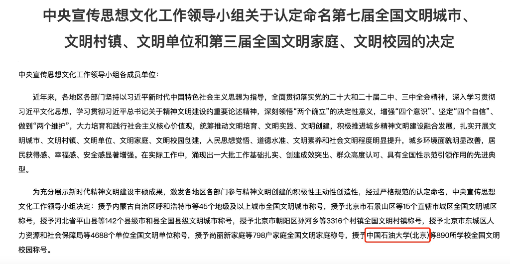 中國石油大學(北京)獲授“全國文明校園”稱號