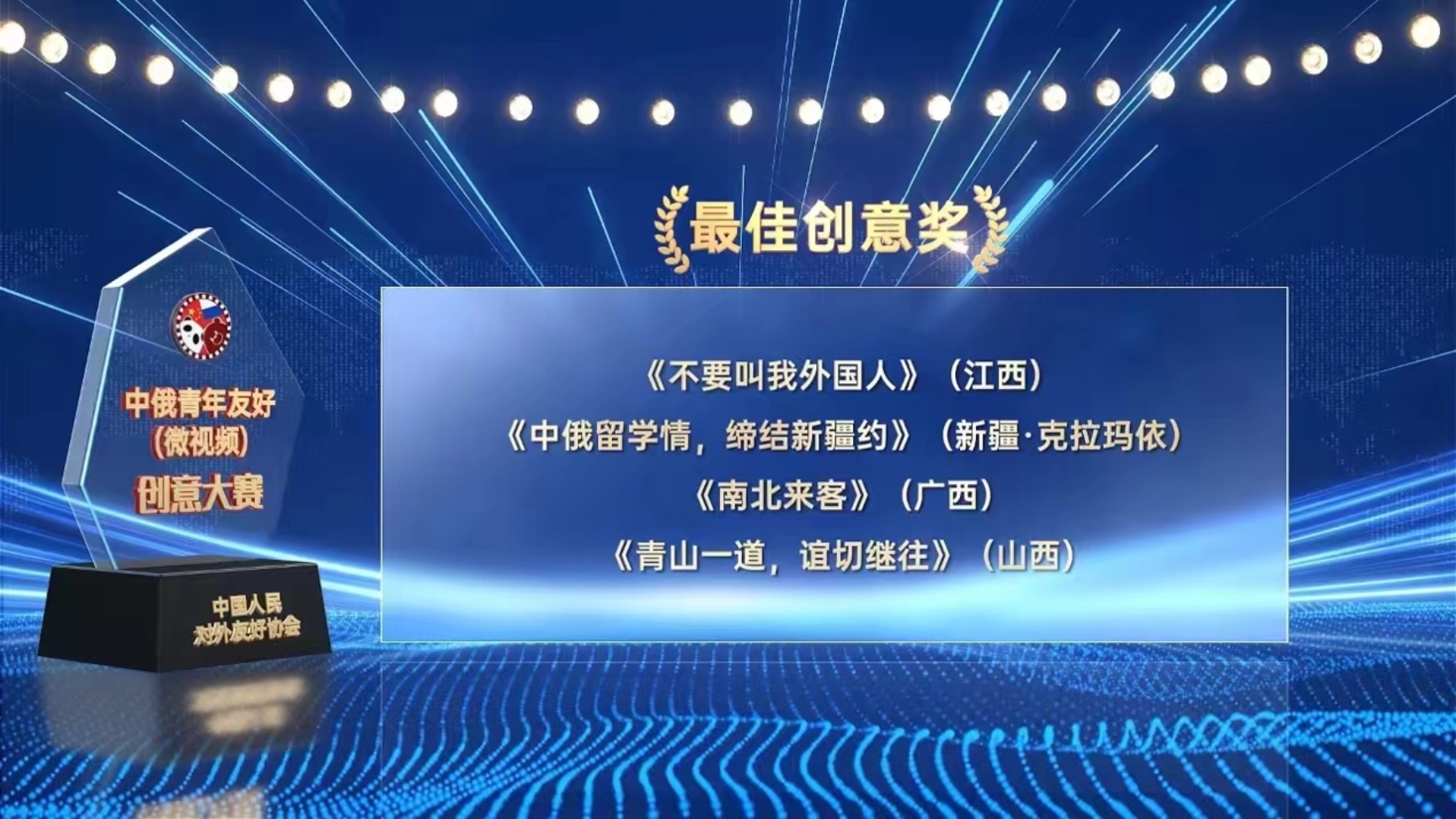中俄青年友好(微視頻)創(chuàng)意大賽是2024年4月由中國人民對外友好協(xié)會與中國俄羅斯友好協(xié)會在中俄文化年框架內(nèi)共同發(fā)起的賽事,旨在慶祝中俄建交75周年和中俄友協(xié)成立75周年,進一步弘揚中俄世代友好精神。大賽以“鏡頭中的友誼”為主題,主要面向在中國學(xué)習(xí)生活的中國和俄羅斯青年征集創(chuàng)意短視頻作品。活動評選出“最佳創(chuàng)意獎”“最佳人氣獎”“優(yōu)秀作品獎”“優(yōu)秀組織獎”四類獎項。活動啟動以來,組委會共收到參賽作品336件。參賽者分別來自中國24個省、市、自治區(qū)的58個城市,其中包括42名在華生活工作學(xué)習(xí)的俄羅斯青年。根據(jù)評審方案,經(jīng)專業(yè)評審委員會評審,大賽最終評選出“優(yōu)秀組織獎”(3個)“組織貢獻獎”(15個)“最佳創(chuàng)意獎”(4個)“最佳人氣獎”(3個)和“優(yōu)秀作品獎”(75個,寓意中俄建交75周年)。活動在大賽指定媒體平臺央視中俄頭條客戶端及其他訪問渠道總訪問人次達115萬。