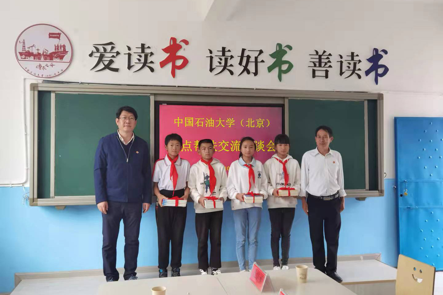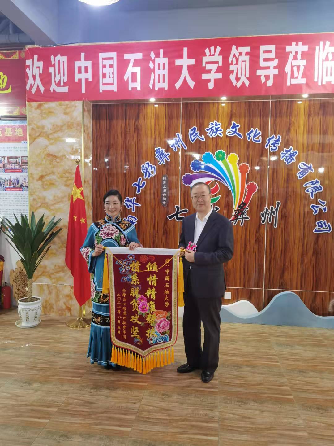 座談會后,陳峰一行赴南華縣思源實驗學校、七彩彝州刺繡加工廠實地考察。在思源實驗學校,陳峰聽取了縣教體局、學校負責人、支教學生的工作匯報,并為石大勵志獎學金獲獎學生代表頒發證書。他表示,中石大將發揮教育幫扶力量的優勢,加大對南華縣基礎教育的支持力度,并勉勵支教學生發揚中石大精神,實事求是,艱苦奮斗,在實踐中長才干、增本領,不負時代,不負韶華。