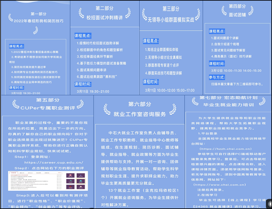學校就業指導中心先后開展2022年春招形勢和簡歷技巧講解、校招面試沖刺精講、無領導小組群面模擬實戰、面試團輔、CUPer專屬職業測評、就業工作室咨詢及宏志助航計劃畢業生就業能力培訓等活動,通過理論講解、實戰演練、個性化指導相結合的方式,重點針對“如何提升簡歷通過率”“群面實戰技巧”等畢業生求職過程中的“痛點”和“難點”開展相關培訓,受到學生的一致好評。學生們們紛紛表示,通過系列培訓活動,充分認識到自身的不足,進一步明確求職方向,拓展了職業視野。