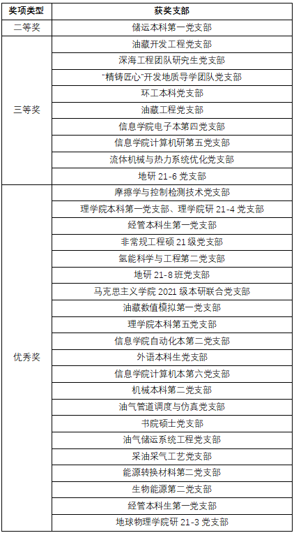 近日,北京市委教育工委公布了2022年北京高校紅色“1+1”示范活動評選結果,經學校推薦、專家初評、現場復評等環節,中石大儲運本科第一黨支部獲2022年北京高校紅色“1+1”示范活動二等獎,油藏開發工程黨支部、深海工程團隊研究生黨支部等9個學生黨支部獲三等獎,摩擦學與控制檢測技術黨支部、理學院本科第一黨支部等22個學生黨支部獲優秀獎,中國石油大學(北京)榮獲“優秀組織獎”。