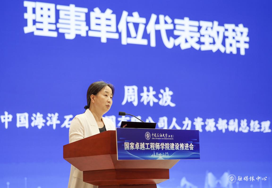 中國海洋石油集團有限公司(以下簡稱“中國海油”)人力資源部副總經理周林波代表理事單位致辭。她強調了建設國家卓越工程師學院的戰略意義,表明了中國海油及兄弟企業與中石大深度融合落實工程碩博士聯合培養工作的決心。她表示,中國海油將以支撐高水平科技自立自強為導向,緊扣國家戰略需求,發揮產業優勢,堅持科研、生產、人才培養一體化,提升自主培養能力,建設高素質人才培養體系,為國家能源安全和民族復興提供人才保障。