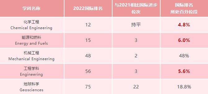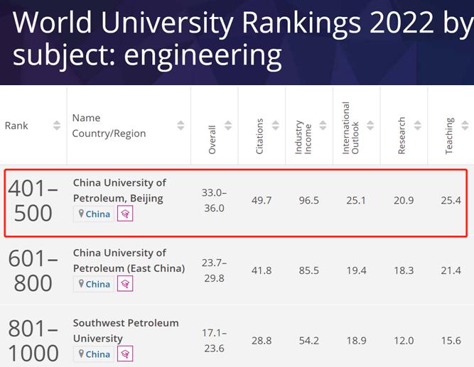 中國石油大學(北京)工程學科“2022THE世界學科”國際排名表現