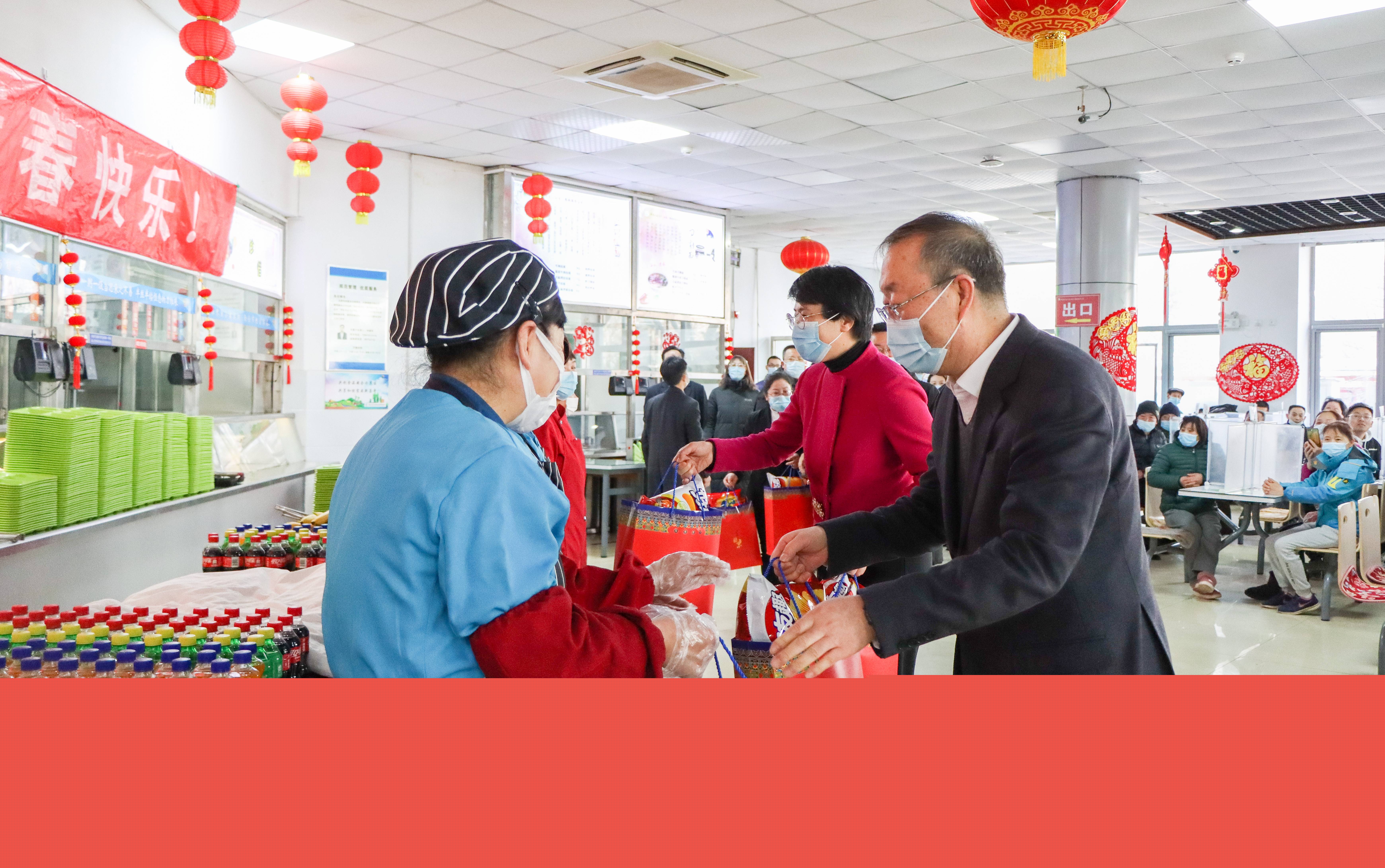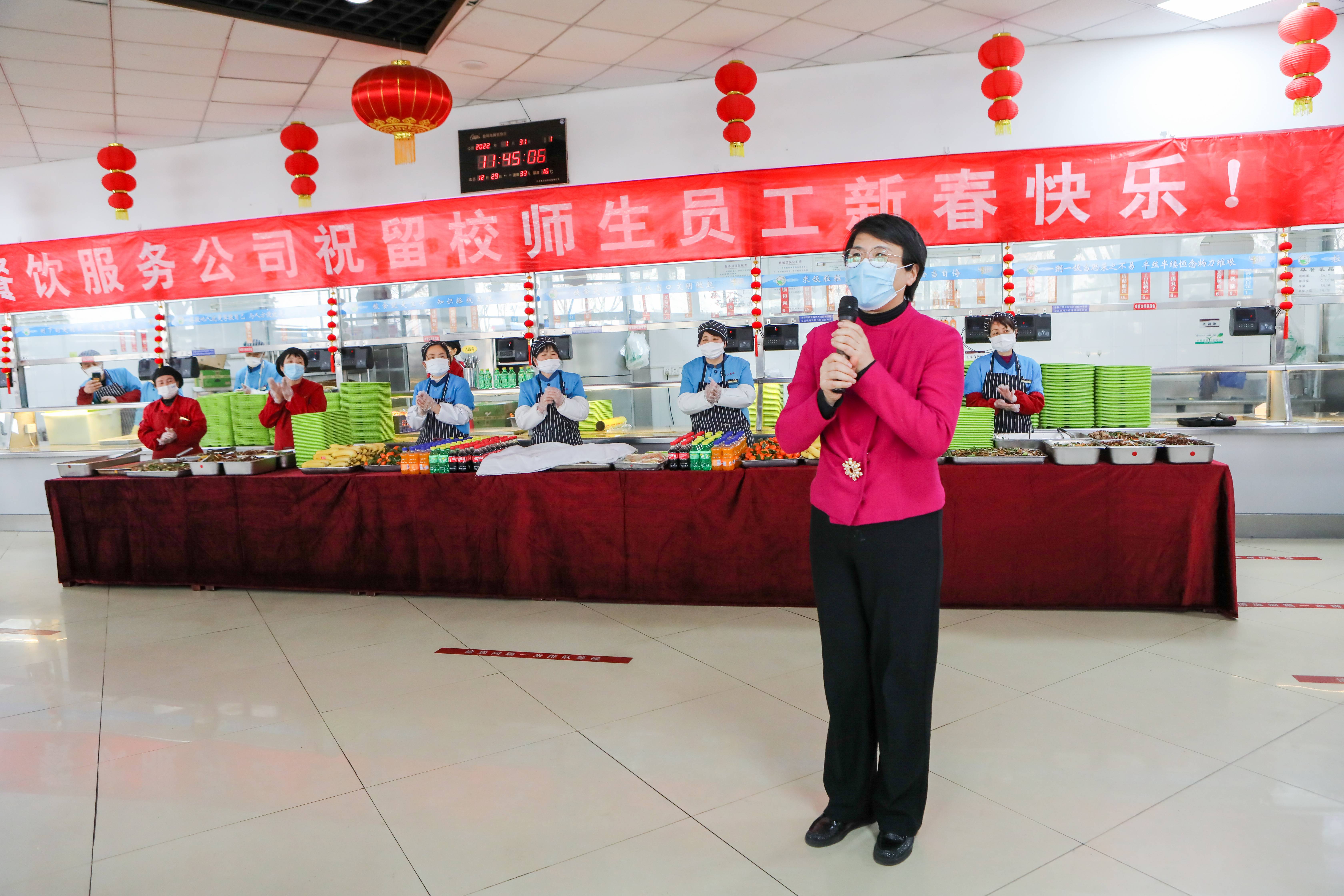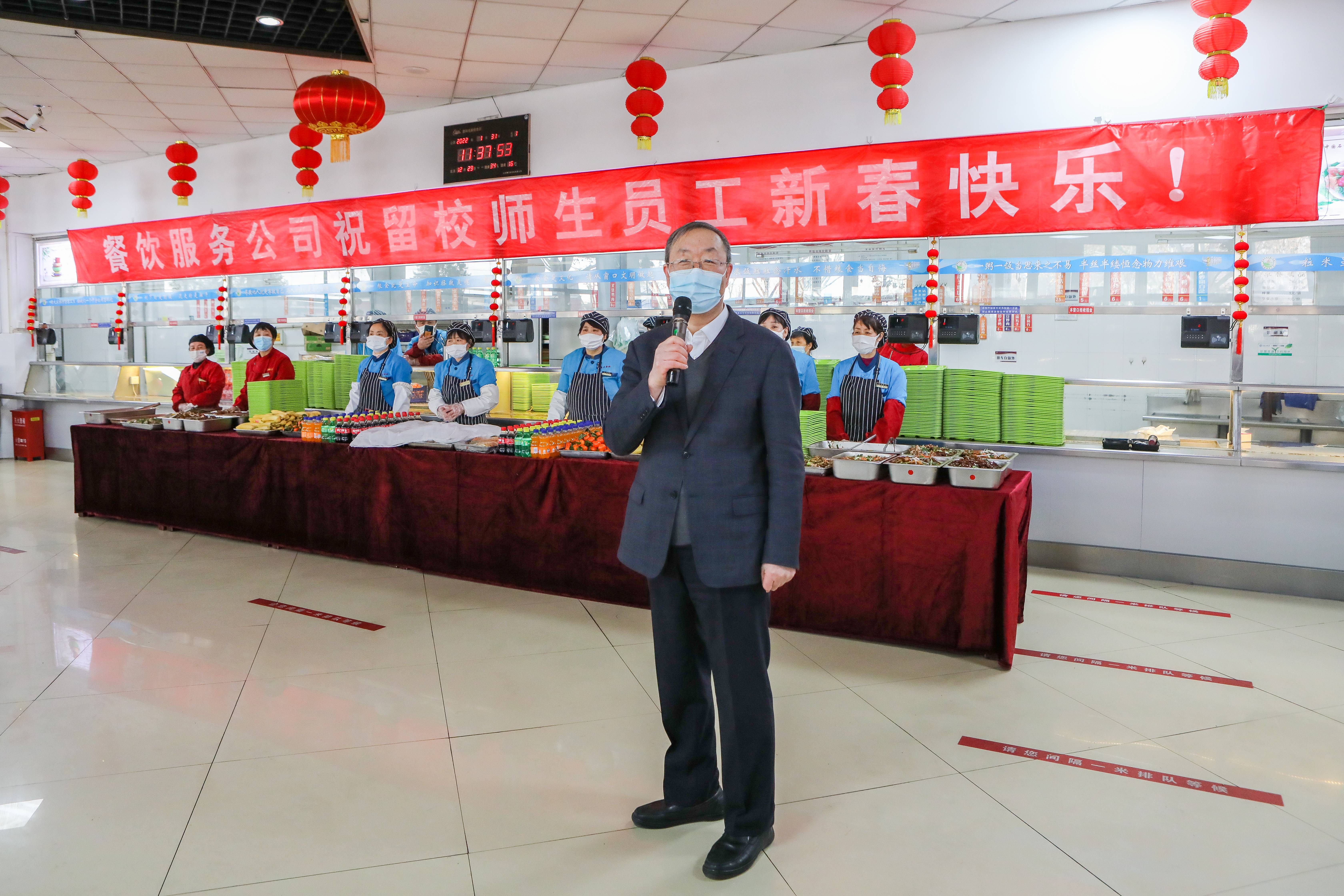 臨近中午,陳峰、吳小林來到第二食堂,向工作人員表示慰問,給留校師生員工拜年。