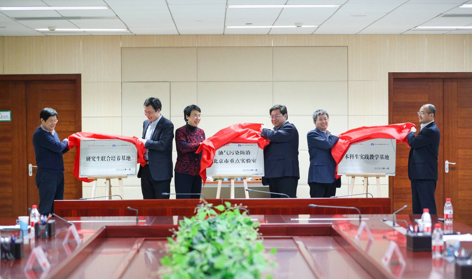 吳小林、張馳、金衍、韓建國、劉植昌、李堅等共同為“油氣污染防治北京市重點實驗室”“本科生實踐教學基地”“研究生聯合培養基地”揭牌。