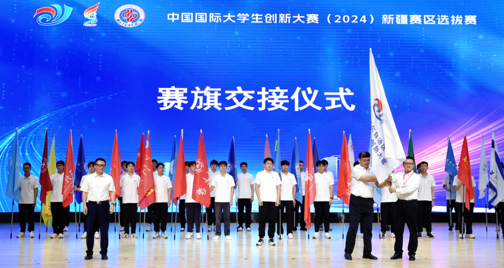 頒獎典禮上進(jìn)行了賽旗交接儀式。2025年,中國國際大學(xué)生創(chuàng)新大賽新疆賽區(qū)選拔賽將由新疆師范大學(xué)承辦。
