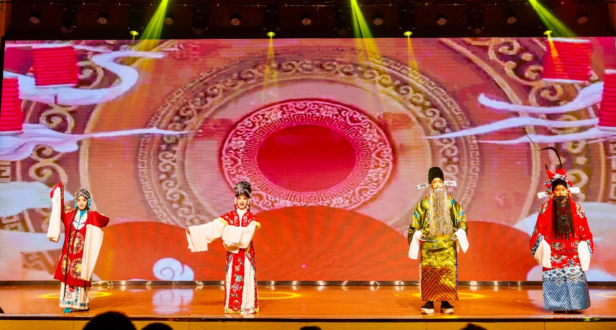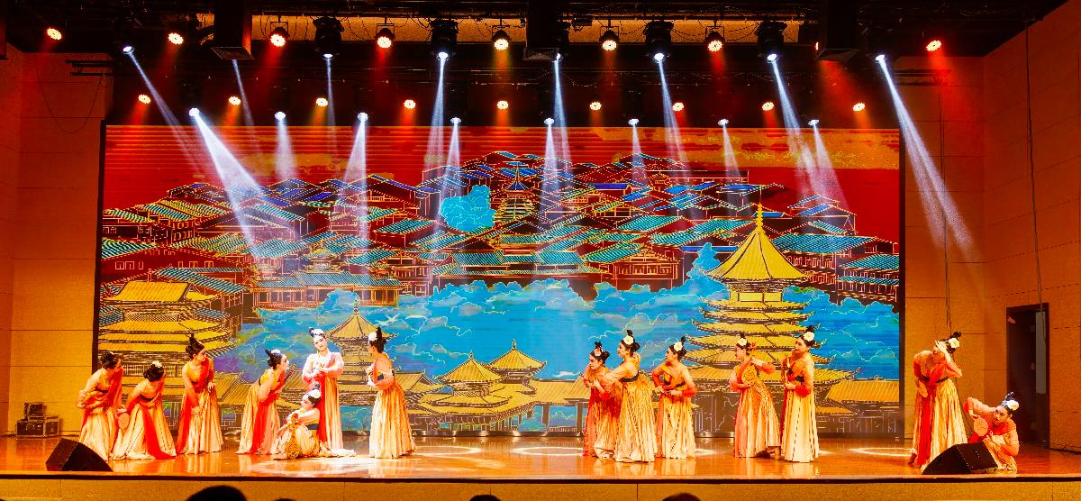 “閃光”篇章中,大學(xué)生藝術(shù)團(tuán)舞蹈團(tuán)表演的《唐宮夜宴》穿越古今,以青春婀娜的舞蹈重現(xiàn)大唐盛世的社會(huì)風(fēng)貌,展現(xiàn)民族文化的璀璨輝煌。