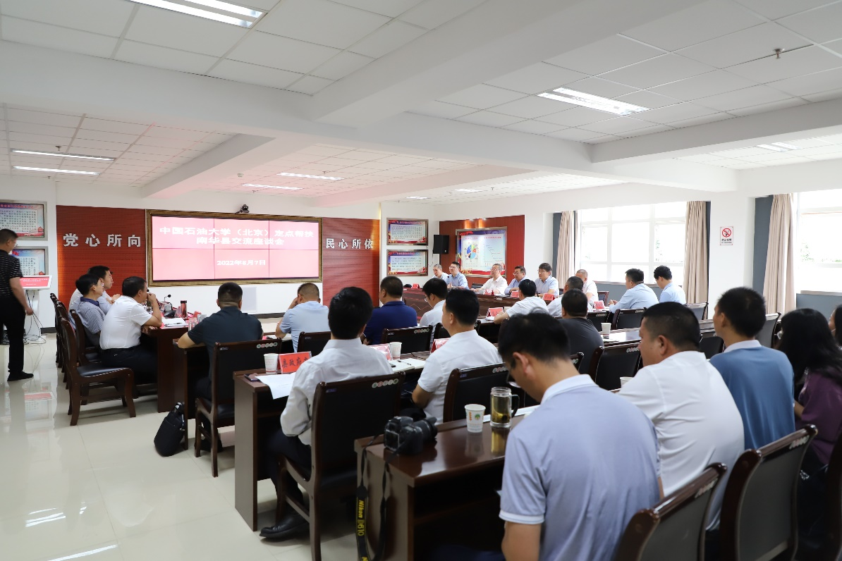 8月7日,中國石油大學(北京)幫扶交流座談會在南華縣召開。州委常委、副州長張建軍,南華縣委書記馬特,縣委副書記、縣長陳如軍以及縣委縣政府相關負責同志參加會議。馬特介紹了南華縣鞏固脫貧攻堅成果及推進鄉村振興發展情況,并對學校在各方面工作給予的幫助表示感謝。張建軍表示,中石大的各項幫扶舉措有實效、可持續,助力了楚雄南華縣經濟社會發展和人民群眾增收,更加堅定了南華人民創造美好生活的信心與決心。