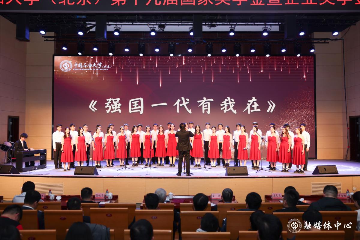 頒獎典禮在大氣恢弘的管弦樂合奏《不懼風暴》中拉開帷幕,以“立能源報國大志向 做挺膺擔當奮斗者”為主題,通過“弦歌”“誓言”“風華”三個篇章,由獲獎學生代表開展了主題講述。在“弦歌”篇,與會嘉賓師生觀看了學校專題宣傳視頻《扶光》,視頻以青春視角開展創新講述,分享看見光、追逐光、成為光、發散光的成長之路。獎學金獲得者馮浩暉、郭文宣、蔣昆以原創詩朗誦《弦歌》表達了新時代學子心中的感恩之情,回顧了學校艱苦創業的奮斗歷程,展現了新時代大學生的青春風采。在“誓言”篇,國家獎學金、校十佳大學生獲得者、北京大學在讀博士生趙冰珂,國家獎學金、中國石油獎學金、萬華化學集團獎學金獲得者劉慶熾,分享了他們堅持腳踏實地、書寫青春夢想的故事。在“風華”篇,國家獎學金、孫越崎優秀學生獎獲得者、捐獻造血干細胞志愿者張壯壯,宿舍全員保研的本科生代表劉家懿,王濤英才獎學金獲得者哈森,共同講述“風華映初心 創新筑匠心”的成長經歷,分享了他們用行動詮釋生命關愛、追求創新、敢于擔當的情懷。大學生合唱團演唱《強國一代有我在》。頒獎典禮在校歌《我為祖國獻石油》的歌聲中落下帷幕。