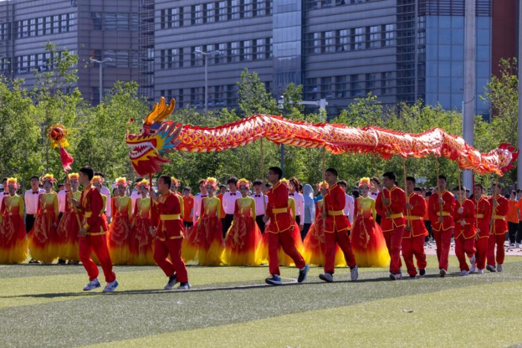1200余名師合力呈現了精彩的開幕式表演。行云流水的太極拳、青春動感的健美操、氣勢昂揚的跆拳道、優雅輕盈的華爾茲……表演團隊帶來了體育教學成果節目匯演《少年中國  逐夢未來》。克拉瑪依市第二中學舞龍舞獅隊受邀參與表演,鑼鼓陣陣、龍隨鼓起,隊員們用青春展現了中國傳統文化的獨特魅力。