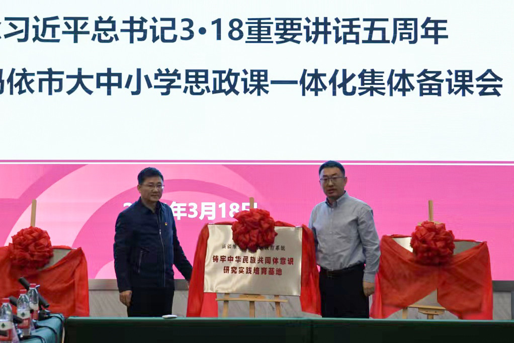 會上,張紅艷帶領參會人員重溫了習近平總書記在學校思想政治理論課教師座談會上的重要講話核心內容。唐勇和徐長亮共同為馬克思主義學院“鑄牢中華民族共同體意識研究實踐培育基地”“‘大思政課’實踐教學基地”“大中小思政一體化牽頭校”三個自治區級建設平臺揭牌。