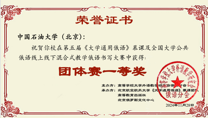 日前,中石大外國語學院多名學生在小語種大賽中獲獎。外國語學院西班牙語教師丁寧指導的2023級外國語言文學碩士張辰芊(唯一非西班牙語專業的參賽者)演唱曲目《Gloria》獲優秀獎,此前,張辰芊還在外語風采大賽上獲詩歌朗誦賽道一等獎;外國語學院團體代表中石大在第五屆《大學通用俄語》慕課及全國大學公外俄語線上線下混合式教學俄語書寫大賽中獲團體賽一等獎,外國語學院教師李宏宇被評為優秀指導教師;外國語學院國際中文教育專業“華關智行”團隊的參賽作品《中文+海關:“通關”中文教學實踐案例》在首屆國際漢語教學案例大賽中獲三等獎。