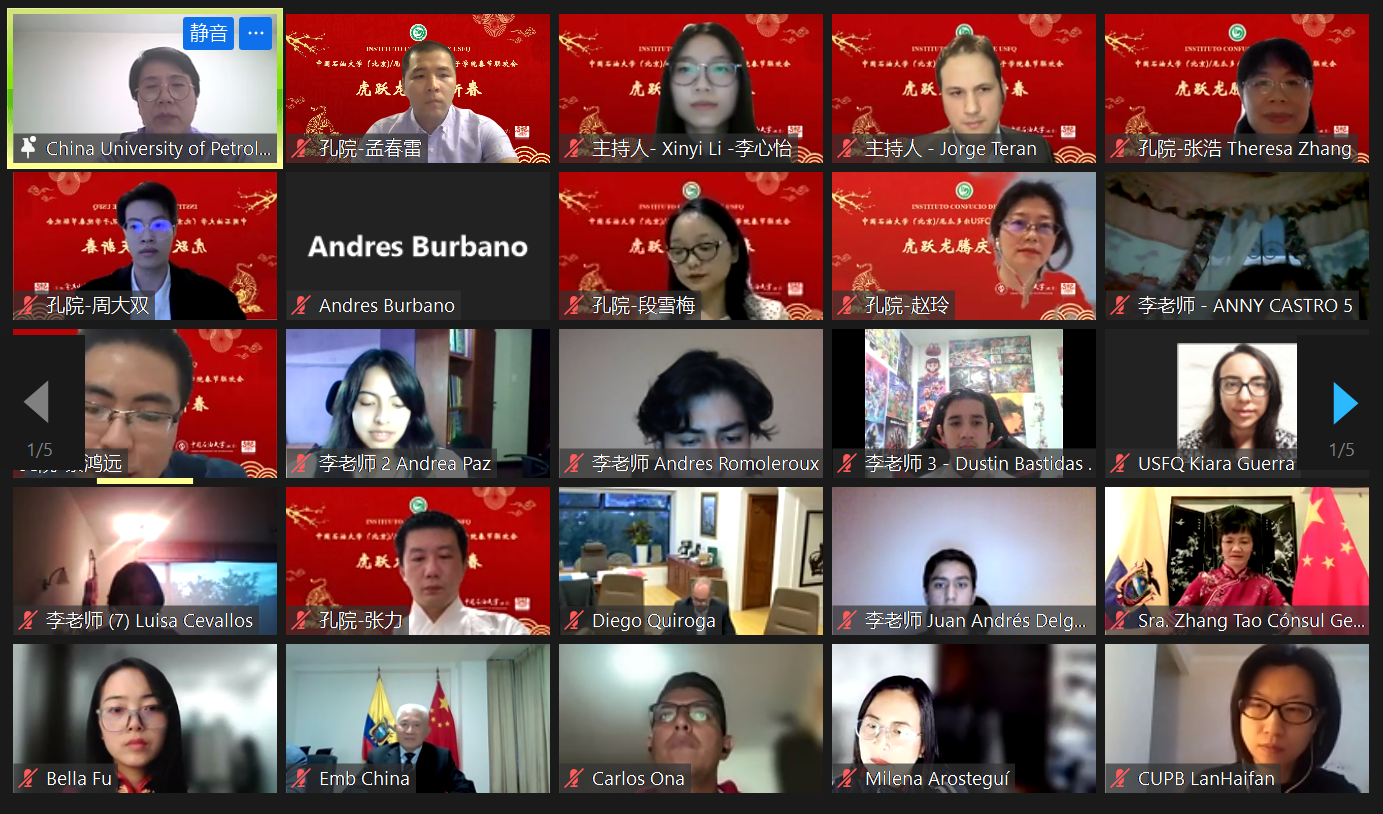 當地時間1月28日晚,中國石油大學(北京)與厄瓜多爾基多圣弗朗西斯科大學合作共建的孔子學院舉辦“虎躍龍騰慶新春”2022年春節聯歡會。中國駐厄瓜多爾大使陳國友、駐瓜亞基爾總領事張滔、中國石油大學(北京)校長吳小林、基多圣弗朗西斯科大學校長迭戈·基洛加、孔子學院中方院長張浩、外方院長基婭拉·格拉,中石大國際合作與交流處負責人及孔子學院師生等各界人士130余人線上參加活動。