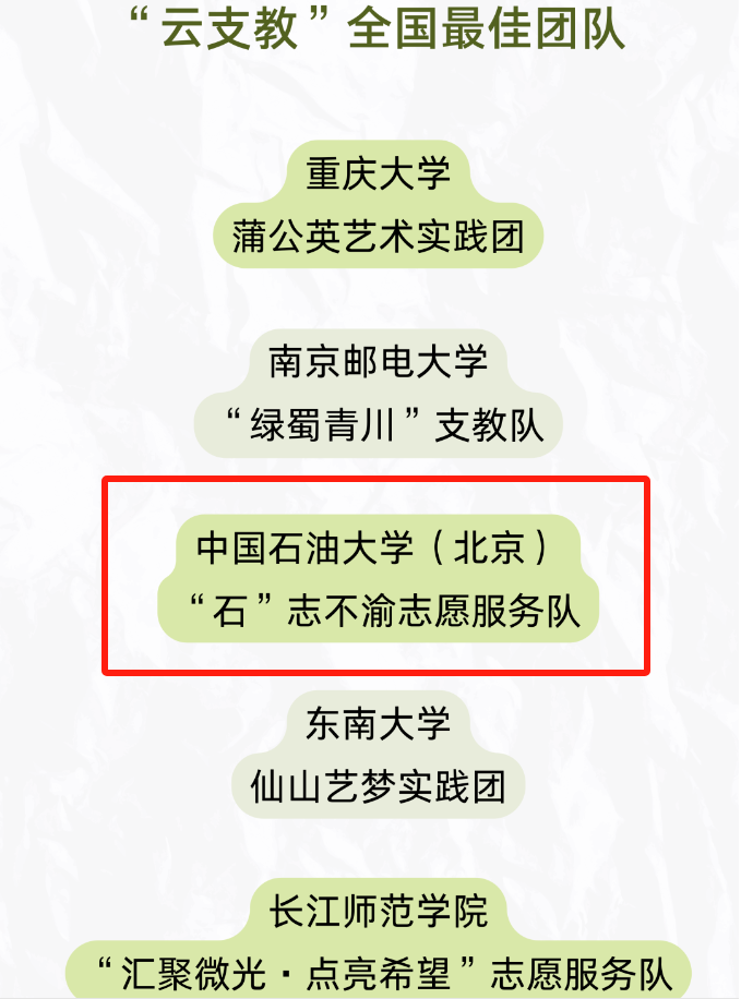 近日,由中國知行計劃和團中央“美麗中國·青春行動”倡導開展的“美麗中國·青春行動”第六屆云支教鄉村教育獎成果公布,石油工程學院“石”志不渝志愿服務隊獲評“云支教”全國最佳團隊(全國5支),“鐵人先鋒”青年志愿者協會獲評“云支教”全國優秀團隊(全國35支)。