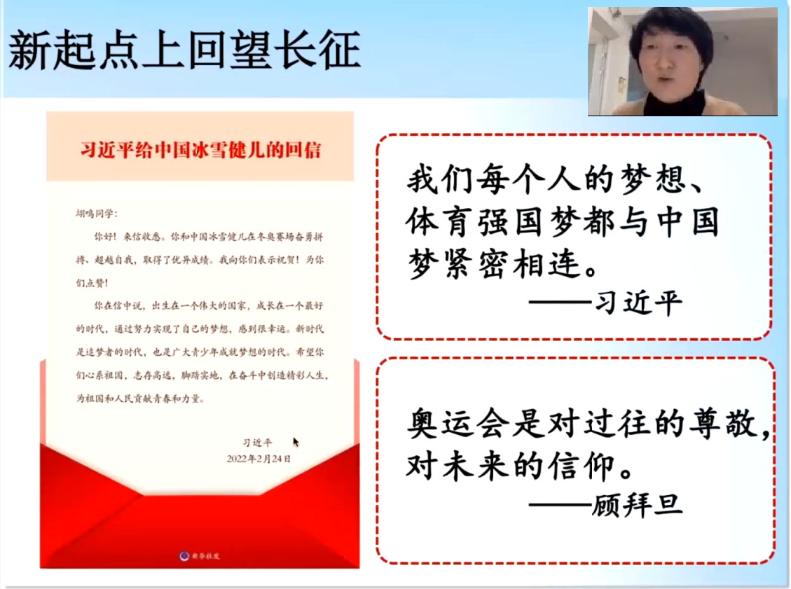 學(xué)校馬克思主義學(xué)院副教授、首批北京高校教書育人“最美課堂”獲獎教師余燕飛講授了“冰雪大國的長征路”專題思政課。她結(jié)合舉辦冬奧會的大背景,將黨史學(xué)習(xí)教育貫穿始終,從“冰雪奧運長征路”“星火燎原長征路”“走好新時代的長征路”等方面,講述了新時代背景下中國為成為冰雪大國付出的艱苦努力,并總結(jié)了志愿者們在這一屆“精彩、安全、簡約”的冬奧會中展現(xiàn)的青春擔(dān)當(dāng)。