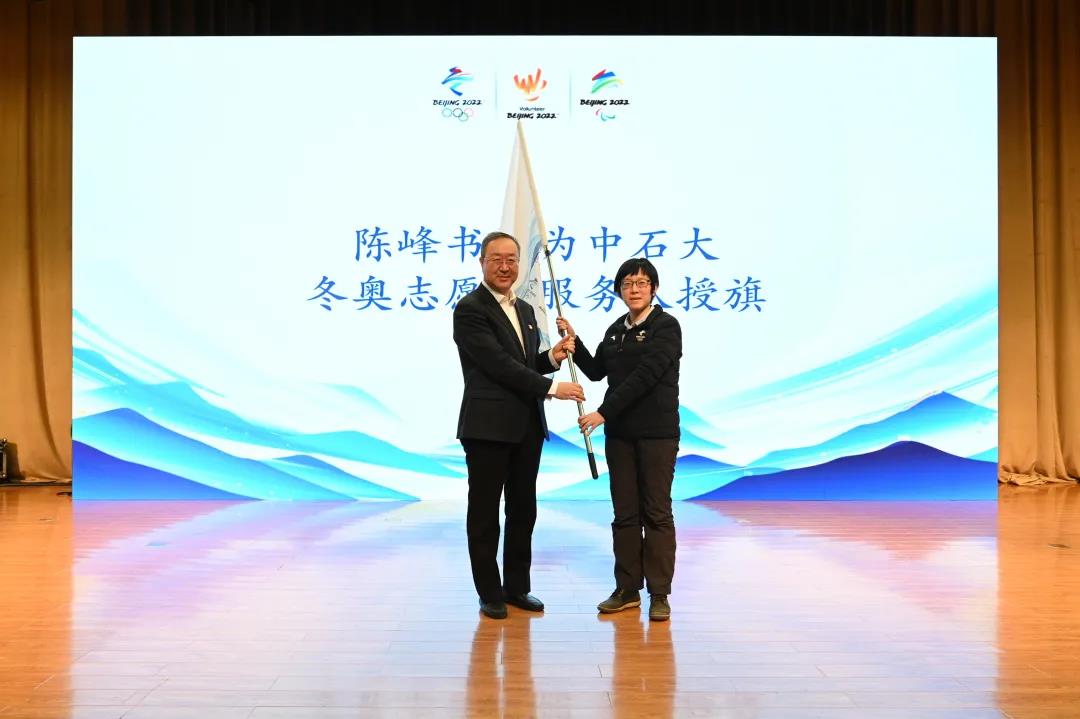 陳峰為冬奧志愿者服務隊授旗,北京冬奧延慶冬奧村(冬殘奧村)場館運行團隊志愿者經理、學校心理健康教育及咨詢中心主任鄧聽接旗