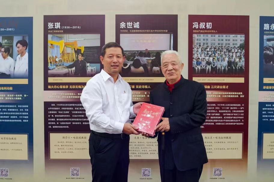 王同奇向余世誠贈送《教育家精神與石油報國》叢書。