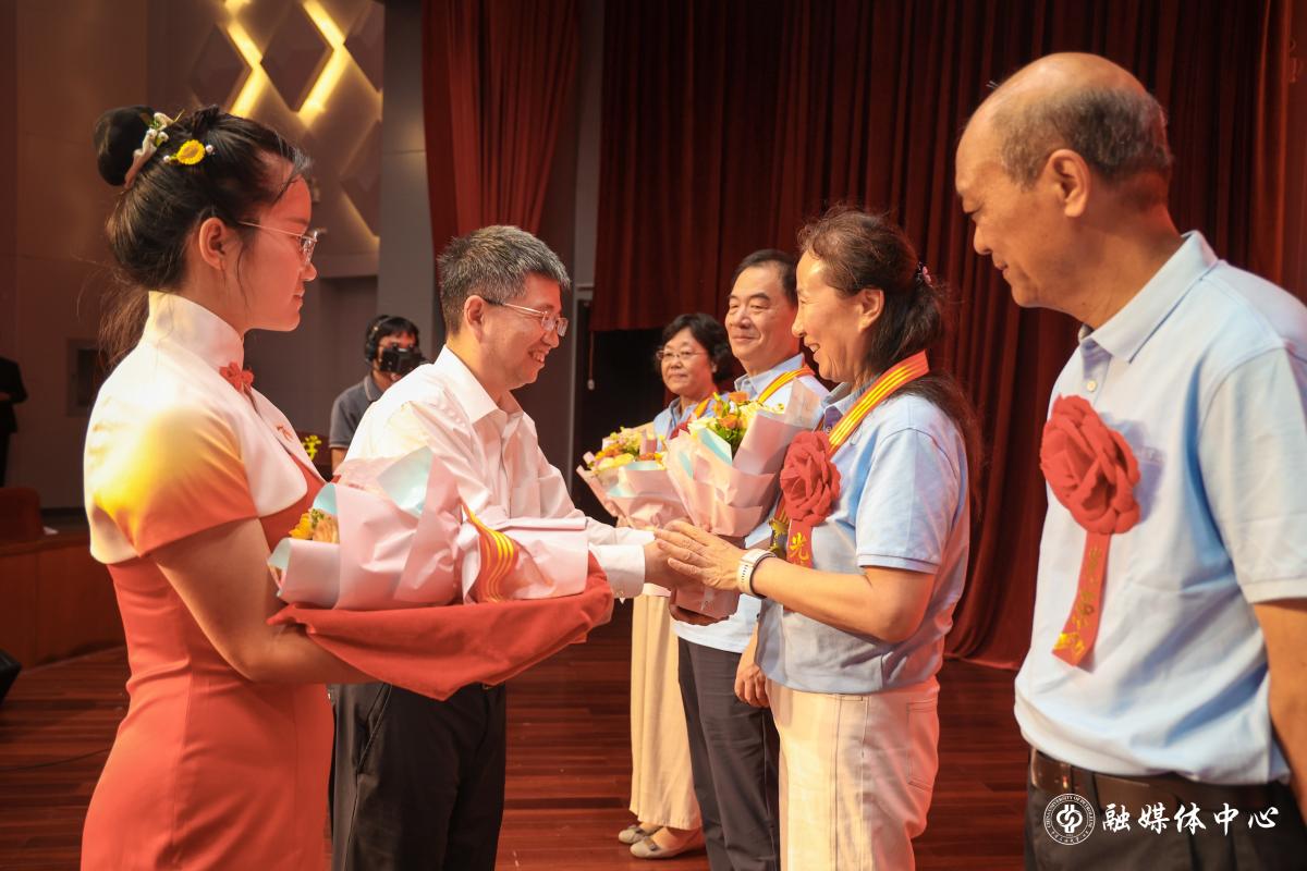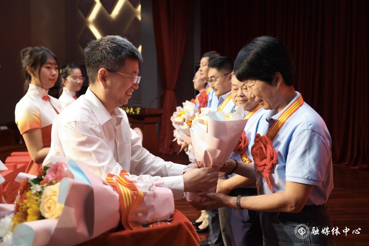 韓克飛和劉植昌為從教三十年的教師代表頒發(fā)證書和紀(jì)念獎牌。致敬他們?nèi)d的奉獻(xiàn)付出,以及“躬耕教壇、強(qiáng)國有我”的使命擔(dān)當(dāng)。