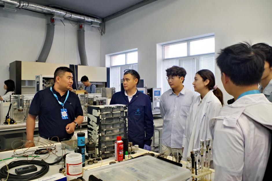 在哈薩克斯坦國家石油天然氣公司,師生近距離觀察阿特勞開采的原油樣品與巖心;里海石油天然氣設(shè)計研究所內(nèi),負責(zé)人系統(tǒng)介紹和展示了石油化工廠、天然氣處理站的設(shè)計邏輯與常用軟件;在New Tech System Group公司車間里,同學(xué)們學(xué)習(xí)了不銹鋼管道的剪切工藝、隔溫材料的特殊性能;在全球最大油田技術(shù)服務(wù)公司斯倫貝謝(阿特勞分公司)、北里海運營公司(NCOC),師生深入了解了行業(yè)的前沿動態(tài)。彭威帶領(lǐng)學(xué)生參觀了阿特勞石油與天然氣大學(xué)分校區(qū)化學(xué)實驗室,學(xué)習(xí)了廢水中氯元素含量測定、石油元素自動分析及油品物性檢測等專業(yè)知識。