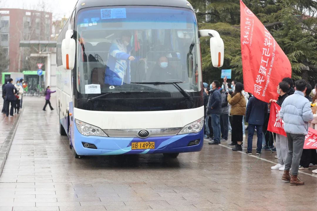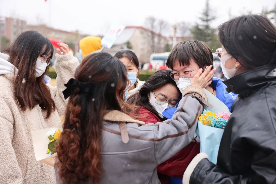 學(xué)校6輛大巴車載著第一批返校的99名志愿者駛?cè)胄@。前來迎接的師生深情演唱歌曲《一起向未來》《雪花》,并將一束束象征著生機(jī)、活力的向日葵獻(xiàn)給志愿者。