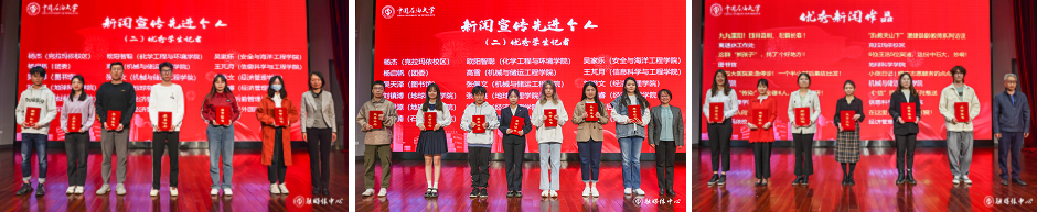 陳峰、韓克飛及相關職能部門負責人為新聞宣傳工作先進單位代表、優秀宣傳案例代表、先進個人代表、優秀新聞作品獲獎代表以及獲評校園文化建設優秀項目代表等頒獎。
