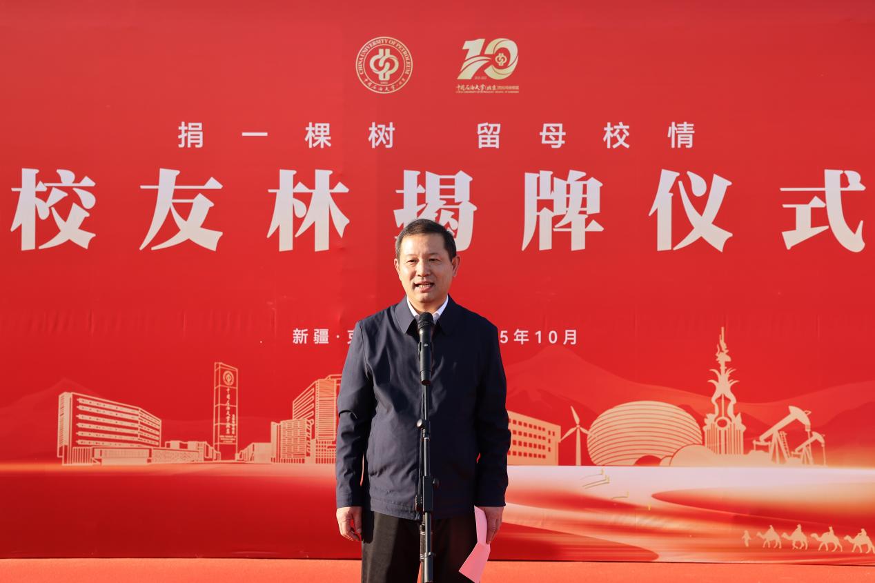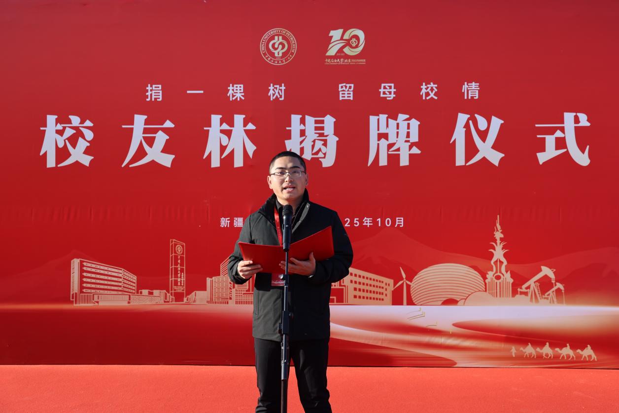 校友代表、克拉瑪依校區2020屆畢業生王良哲宣讀《致全體校友倡議書》,倡議廣大校友不忘初心使命,做石油精神的傳承者、做服務新疆的奮斗者、做愛校情感的傳播者。認捐樹木校友代表、克拉瑪依校區2020屆畢業生董昊菲表達了對母校的感激之情,希望廣大學子如樹木般向下扎根、向上生長,在祖國最需要的地方歷練成才。