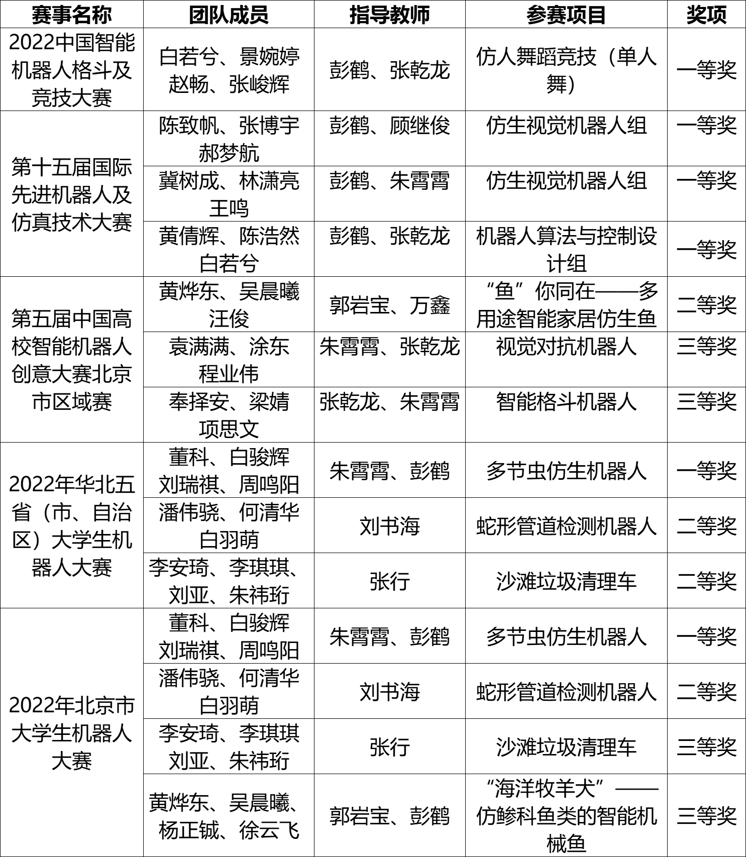 學(xué)校機(jī)械與儲(chǔ)運(yùn)工程學(xué)院本科生白若兮、景婉婷、趙暢、張峻輝在中國智能機(jī)器人格斗及競技大賽仿人舞蹈競技(單人舞)項(xiàng)目中獲得一等獎(jiǎng),該競賽已納入2022全國普通高校機(jī)器人競賽指數(shù)。此外,學(xué)校獲第十五屆國際先進(jìn)機(jī)器人及仿真技術(shù)大賽一等獎(jiǎng)3項(xiàng),獲第五屆中國高校智能機(jī)器人創(chuàng)意大賽北京市區(qū)域賽二等獎(jiǎng)1項(xiàng)、三等獎(jiǎng)2項(xiàng),獲2022年華北五省(市、自治區(qū))大學(xué)生機(jī)器人大賽一等獎(jiǎng)1項(xiàng)、二等獎(jiǎng)2項(xiàng),獲2022年北京市大學(xué)生機(jī)器人大賽一等獎(jiǎng)1項(xiàng)、二等獎(jiǎng)1項(xiàng)、三等獎(jiǎng)2項(xiàng)。朱霄霄、彭鶴皆獲評華北五省(市、自治區(qū))大學(xué)生機(jī)器人大賽優(yōu)秀指導(dǎo)教師和北京市大學(xué)生機(jī)器人大賽優(yōu)秀指導(dǎo)教師。
