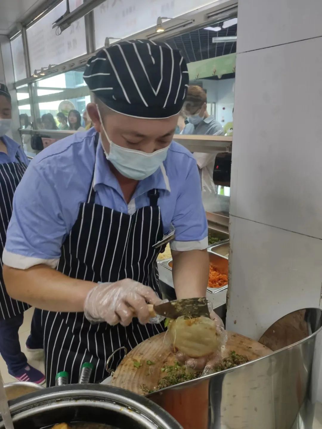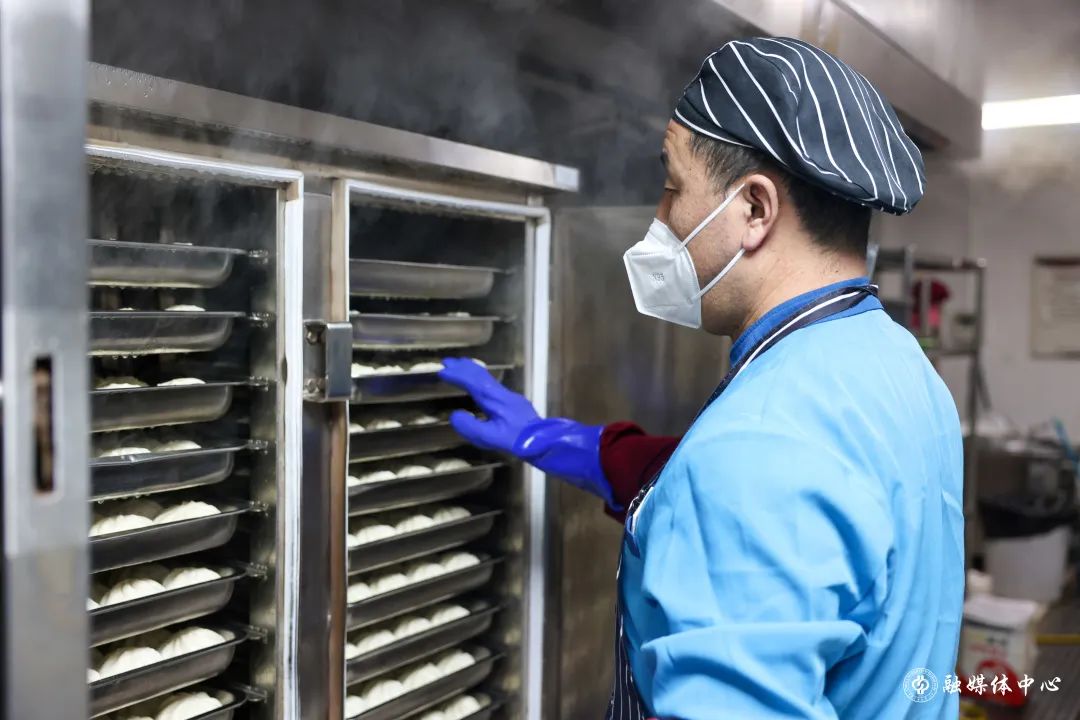 跟劉海濤一樣的餐飲人員還有很多。面對巨大的供餐壓力,餐飲師傅們常常通宵備餐。凌晨2點,就已起床接收原材料;凌晨3點,開始準備早餐包子的加工。天還未亮,就全員集結,開始打包早餐。燈火通明的食堂里,處處是餐飲人忙碌的身影。