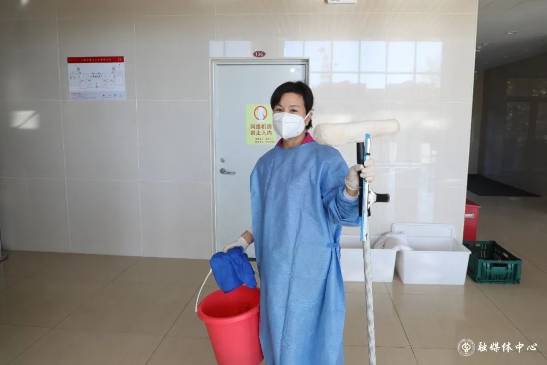 從事保潔消殺的岳建芳:“累肯定是累的,但做好本職工作是我義不容辭的責任。很多老師來到東校園后都住在教室里,每天我看到他們疲憊的樣子也很心疼,大家都不容易,共渡難關!”