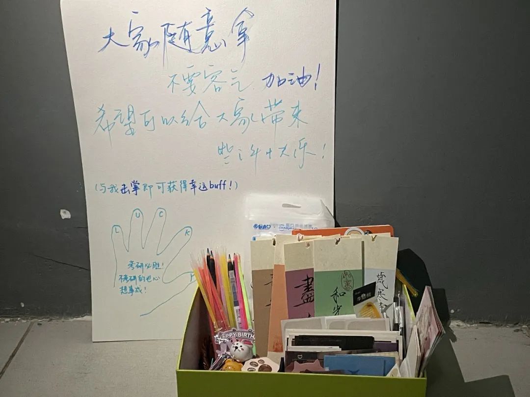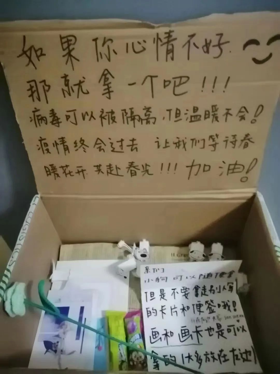 這兩天潤杰公寓2號樓二樓的樓口,同學們被一個方形的盒子吸引。大家隨意拿,不要客氣,加油!”“希望可以給大家帶來些許快樂!盒子旁邊用彩筆寫著這樣的提示語,盒子里擺滿了漂亮的手繪明信片。