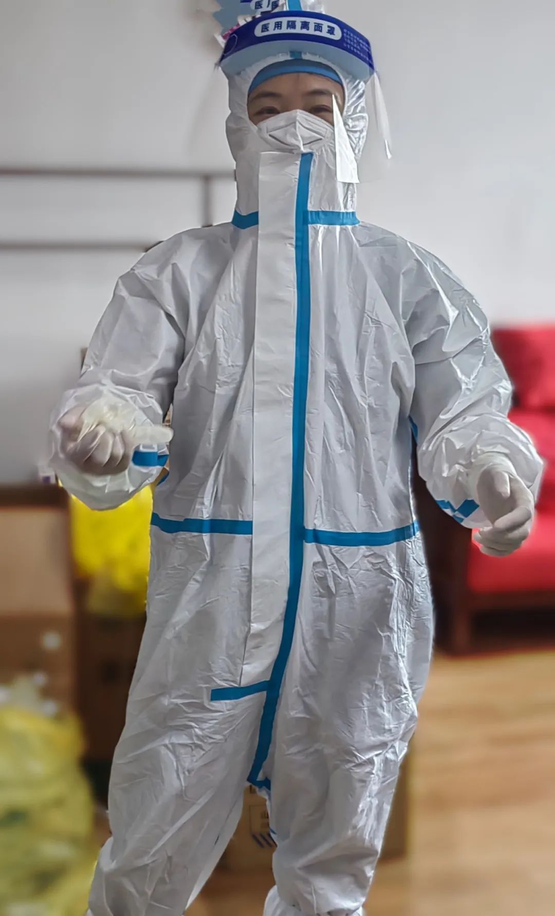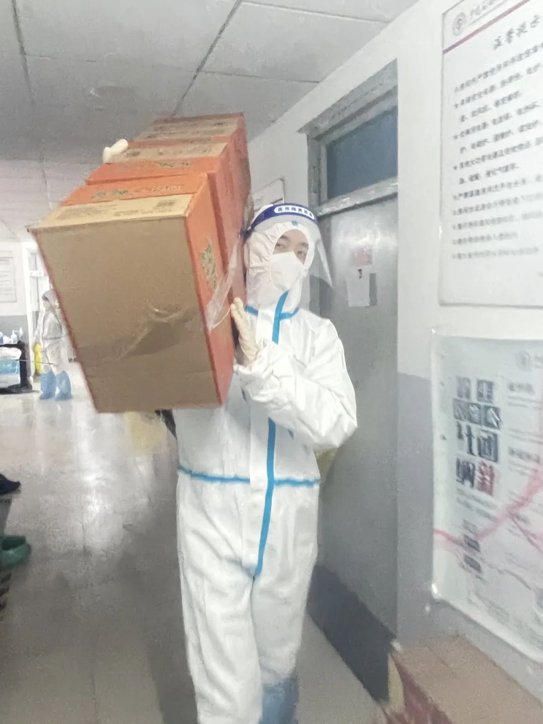 兩兄弟穿著大白,和兩位志愿者一起配送早飯、組織轉(zhuǎn)運、配送午餐、搬運物資、配送晚餐,直到最后一位同學(xué)吃上飯,倆人才顧不得形象,累得一屁股坐下。汗水氤氳模糊了面罩,一天水米未進的胃,陣陣絞痛。