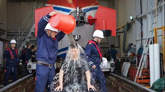 航次首席科學家、中國科學院深海科學與工程研究所王大偉教授為凱旋歸來的楊進教授舉行了澆水禮。澆水禮是載人深潛界的一個傳統:即每一個新下潛的人員,在突破他們個人深潛紀錄的時候,都將進行一次澆水禮。