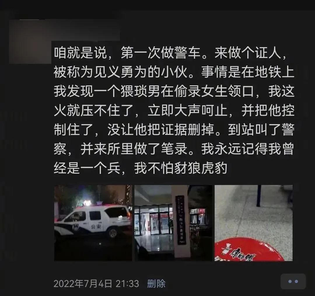事后他發(fā)朋友圈說:“我永遠記得我曾經(jīng)是一個兵,我不怕豺狼虎豹。”