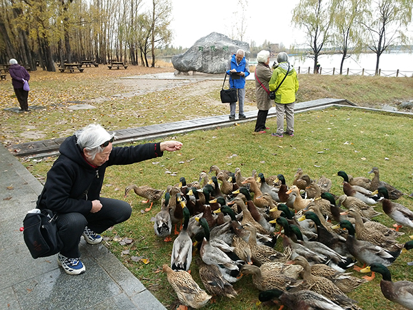 公園里,老同志們被雨后一排排金黃色蘆葦、一簇簇蕩漾在湖面的水草、漫步在湖面上成群的野鴨、蜿蜒曲折的小木橋、遠(yuǎn)處連綿的山脈所構(gòu)成的美景所吸引。他們或駐足拍照,或給野鴨投喂小零食……歡快地在這片被稱為“北京之腎”的京西北綠色生態(tài)基地中感受著自然的氣息。