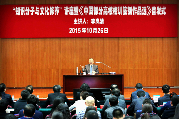 10月26日,中共中央政治局原常委、國務院原副總理李嵐清同志“知識分子與文化修養”講座暨《中國部分高校校訓篆刻作品選》首發式在北京師范大學舉行。首發式上,石大獲贈刻有“厚積薄發,開物成務”校訓的篆刻印。
