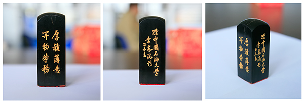 石大獲贈的校訓篆刻印系李嵐清同志創作于2015年,牛角印材,印文篆刻石大校訓“厚積薄發,開物成務”,邊款刻有“厚積薄發,開物成務。贈中國石油大學,李嵐清刊,乙未春”字樣。
