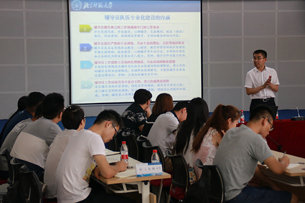 北京師范大學本科生工作處處長、武裝部部長王洛忠受邀作了題為“大學生思想政治教育工作的任務與思考”的主題報告,闡釋和講解了“高校輔導員角色定位”和“輔導員職業能力提升”兩個基本問題,指出輔導員要扮演好政治上的引導員、學習上的輔導員、生活上的指導員、心理上的疏導員和安全上的管理員五種角色,通過增強職業認同、把握學生特點、總結工作規律、加強工作交流、進行科學研究、提升創新能力等十大策略提升輔導員職業能力。