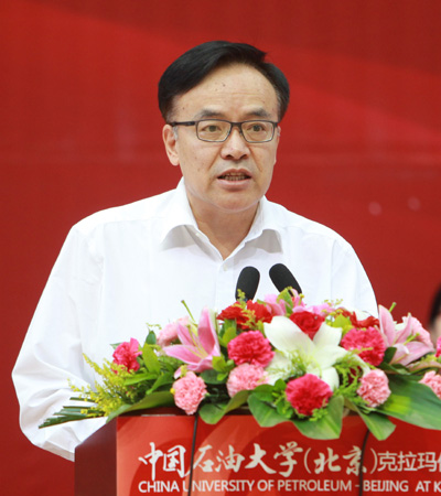 在此,我代表中國石油大學全體師生員工,對專程前來參加典禮的各位領導、各界嘉賓、各位家長,表示衷心的感謝!對在校區起步階段慷慨捐資、熱心助學的企業,表達深深的謝意和敬意!對剛剛加入中國石油大學克拉瑪依校區的461位新同學,表示熱烈的祝賀和歡迎!