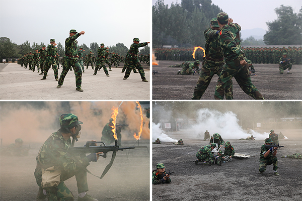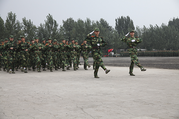 典禮上進行了分列式閱兵匯演,輔導員方隊與20支學生方隊邁著整齊有力的步伐,昂首闊步地走過主席臺,接受校領導和部隊首長的檢閱。在匯報演出中,參訓學生依次表演了軍體拳、匕首操、防身術、三聲三相和“三防”戰術演練等訓練科目。